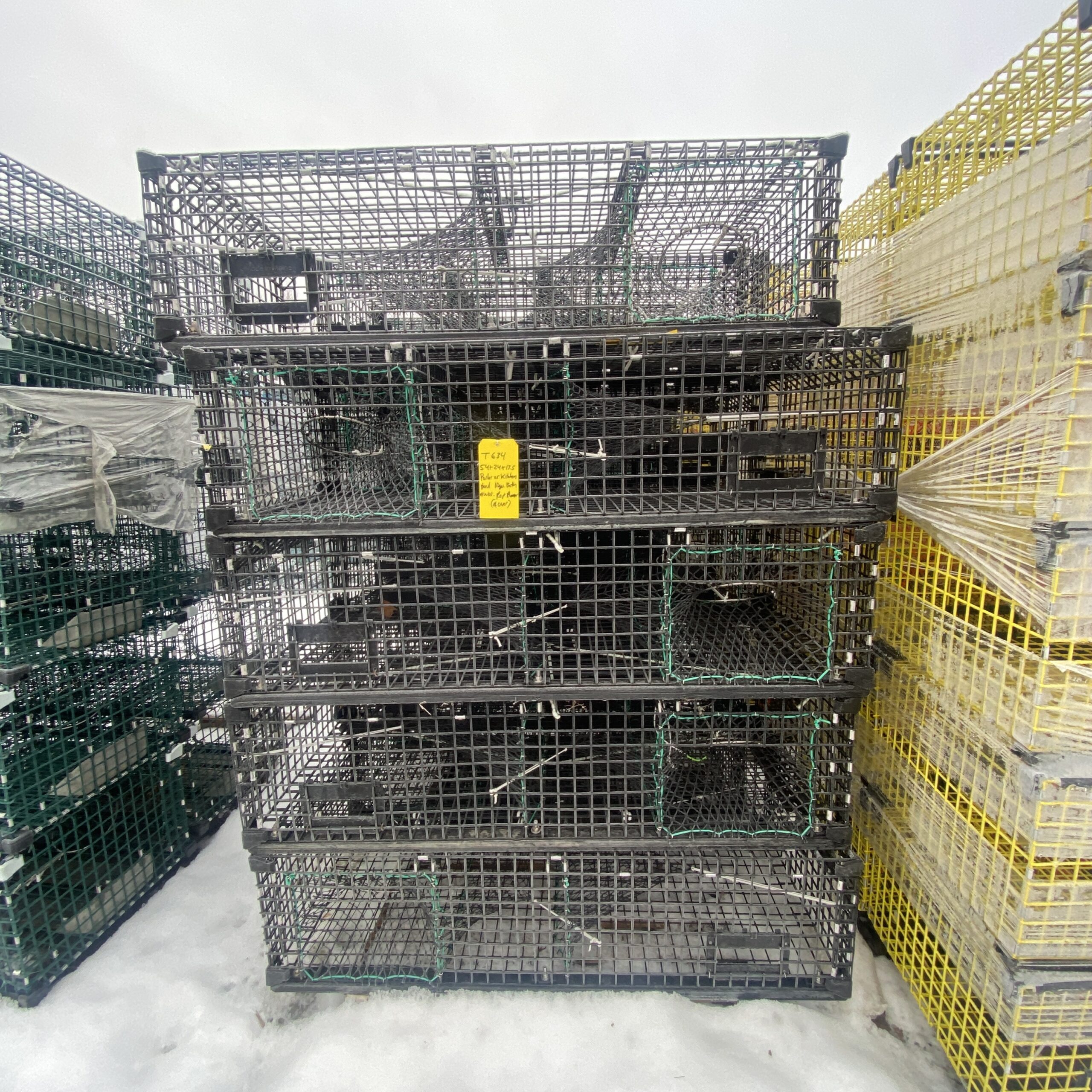 50 – 54″x24″x13.5″ Black Aquamesh wire. 10ga both ends and bridges. Hoop Sides with Hake Mouth Center and Rear heads. Rap rubber coated weighted runners. These traps are setup to haul from either end.